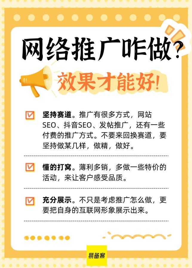 堅(jiān)持賽道。推廣有很多方式,網(wǎng)站SEO、抖音SEO、發(fā)帖推廣,還有一些付費(fèi)的推廣方式。不要來(lái)回?fù)Q賽道,要堅(jiān)持做某幾樣,做精,做好。